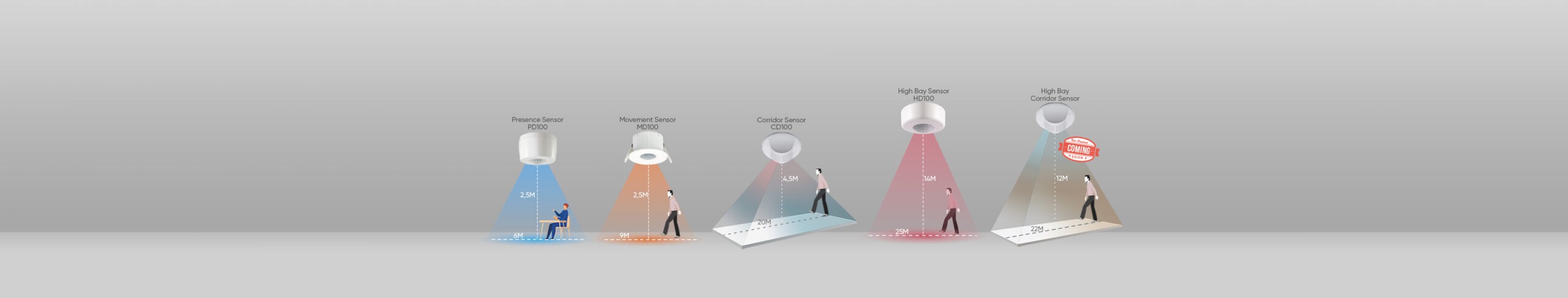 PD100/MD100 KNX Presence Detector is ideal for indoor spaces such as medium to large-size offices, corridors, classrooms, conference and meeting rooms, indoor parking, warehouses and sport halls. The CD100 KNX Corridor Sensor is developed for long corridors and car parking spaces. It comes in two models; flush-mounted and surface-mounted.