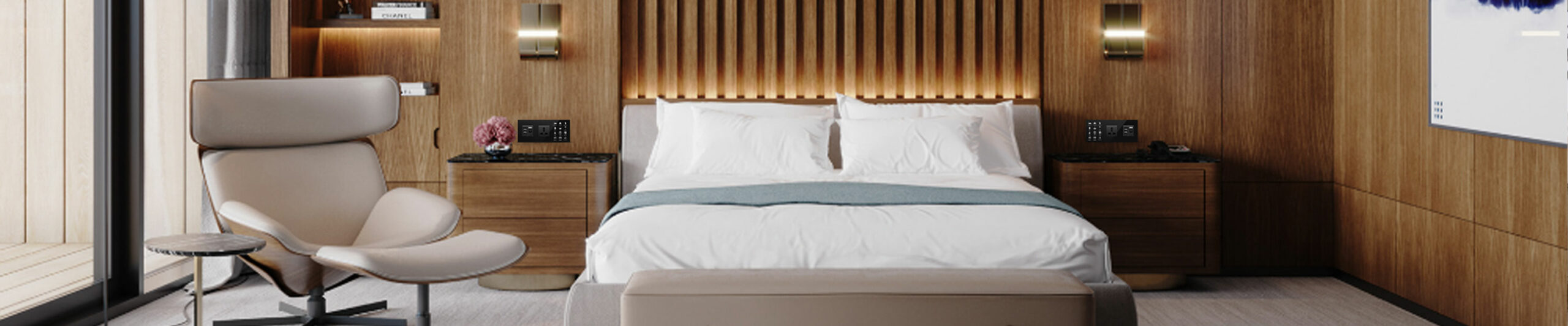 Die Mona Serie bringt Ihnen den gewünschten Komfort! Das Mona Bettseiten-Panel bietet die gewünschte Konfiguration und steuert den Raum mit einer einzigen Berührung.